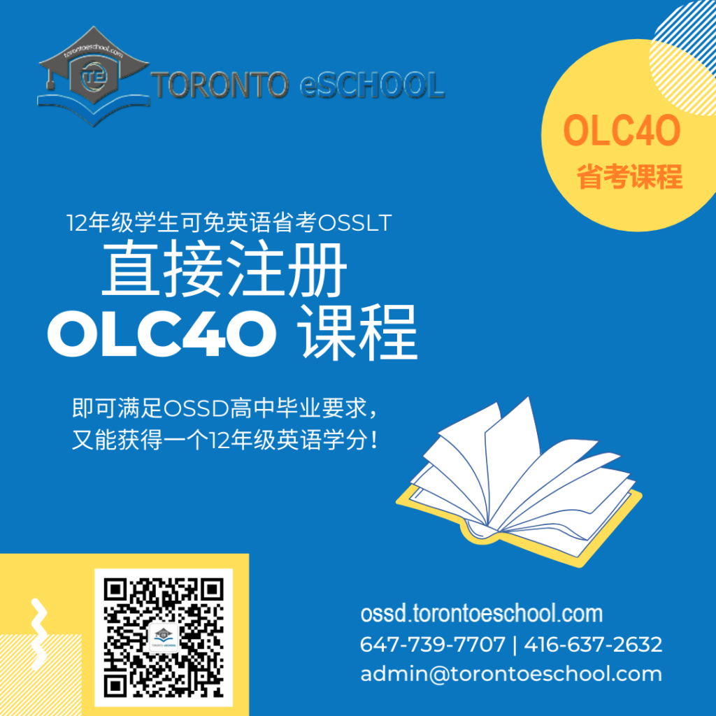 无需参加省考,直接修读 Toronto eSchool 的 OLC4O 学分课程,即可官方替代 OSSLT,满足 OSSD 高中毕业读写能力要求。